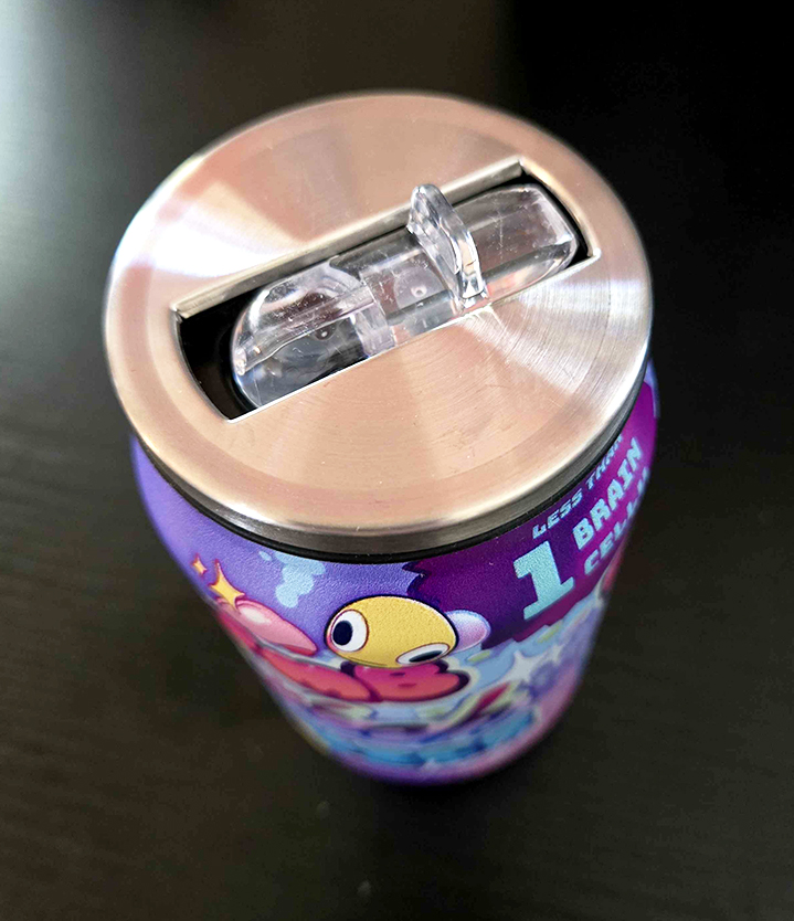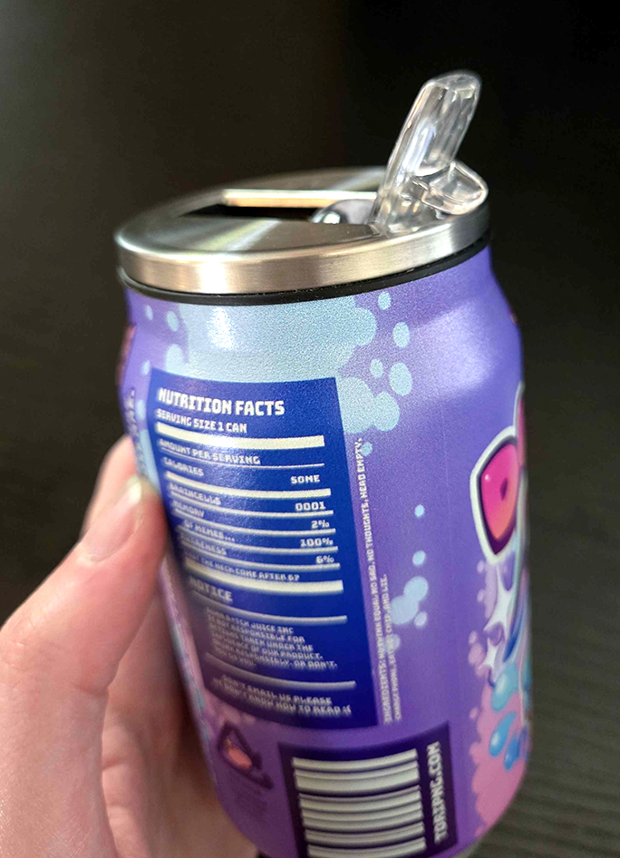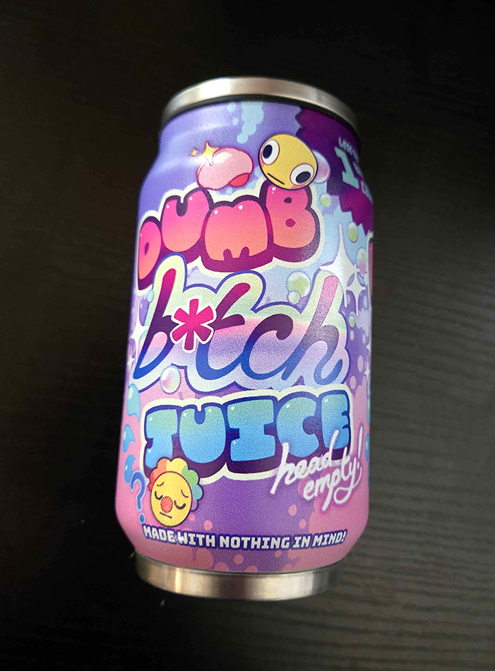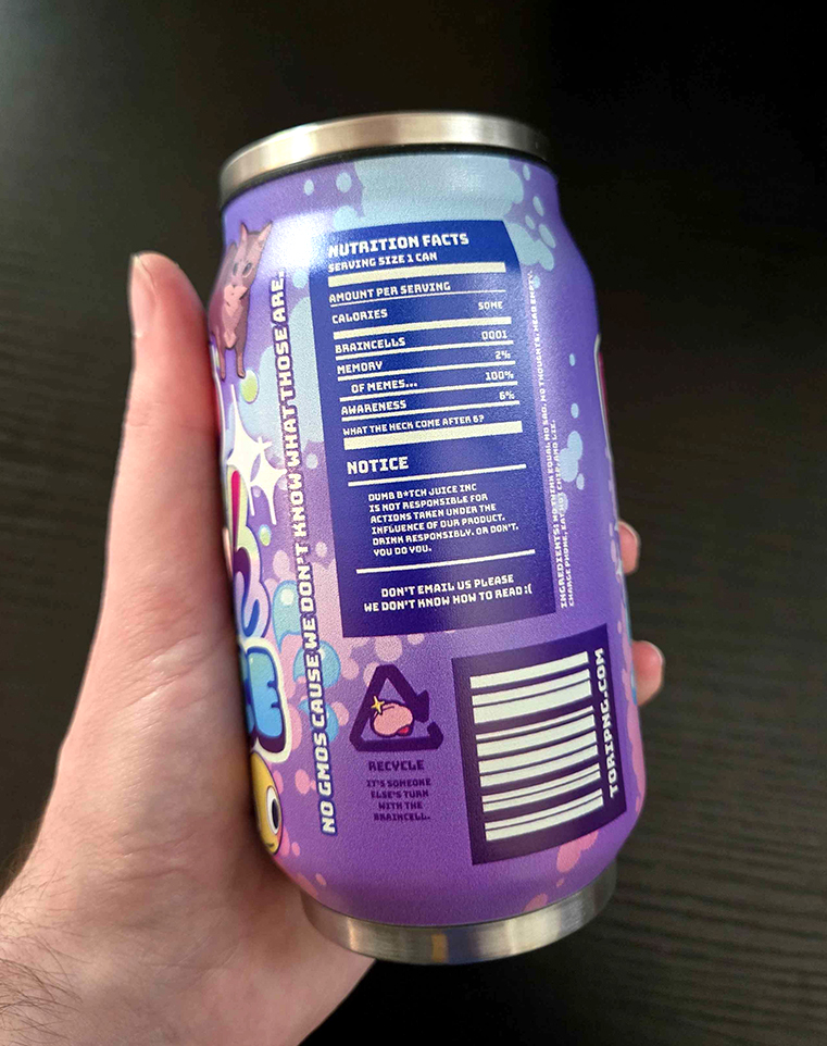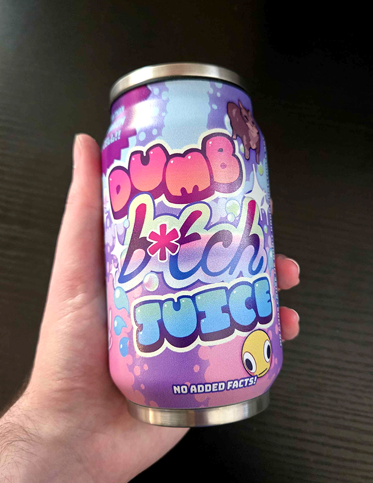 Small 5.5 inch tall steel tumbler with a full wrap design of Dumb B*tch Juice, nutrition facts (flavor text) included! Top piece can be removed, comes with straw attachment.
