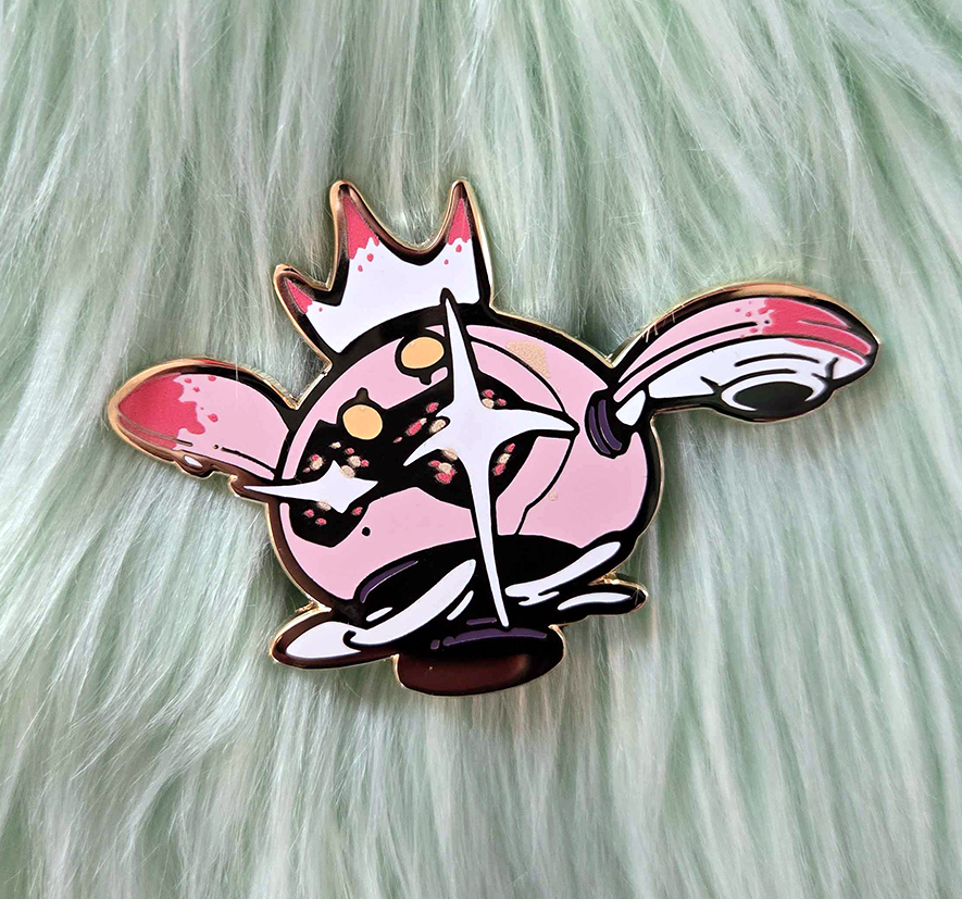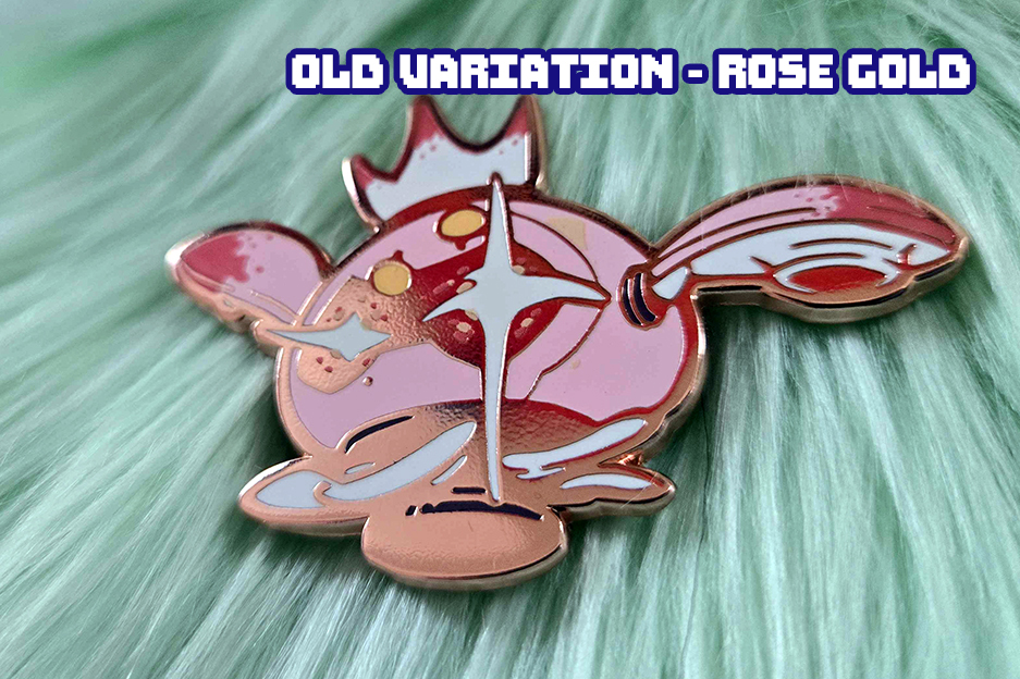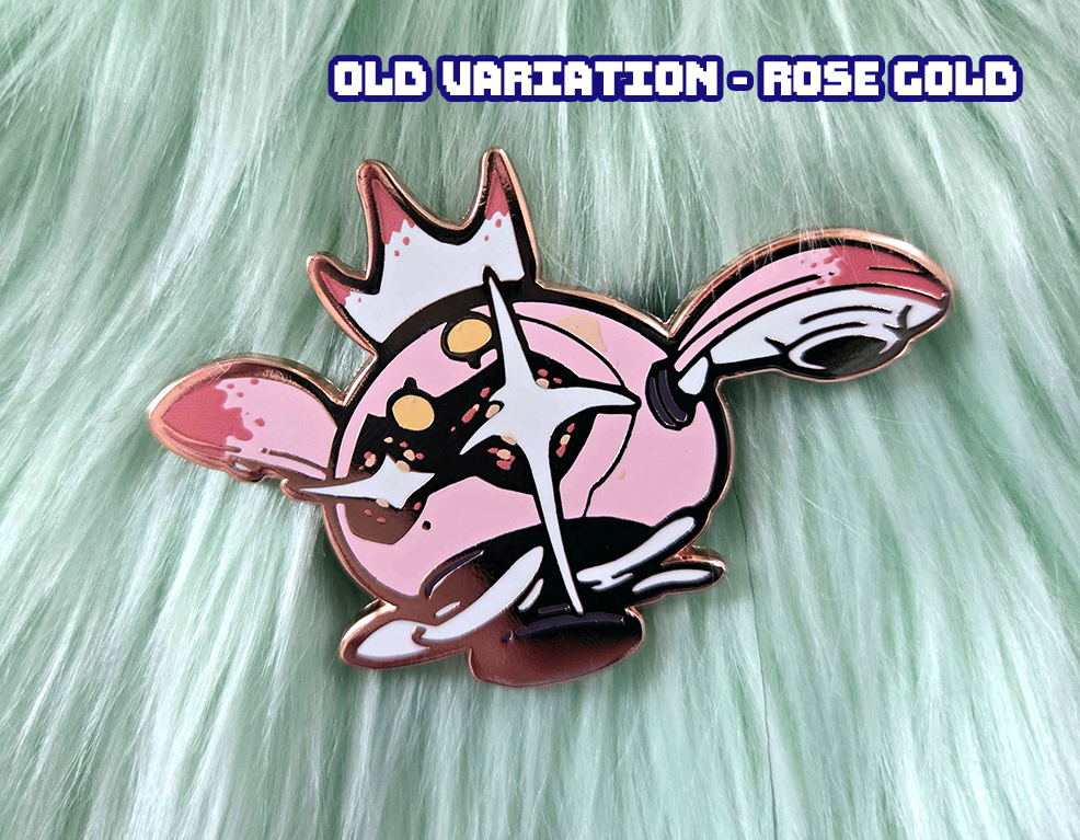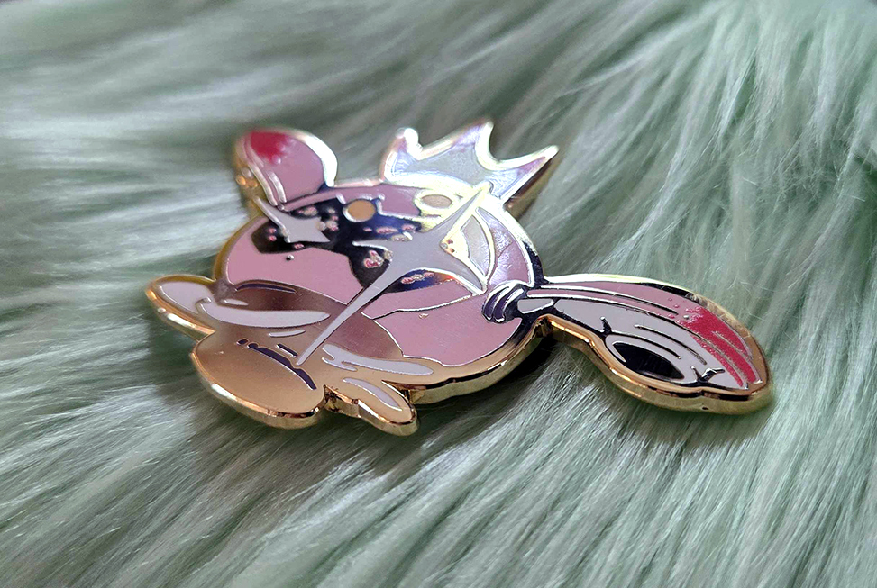 Enamel pin measuring approximately 60mm. Hard enamel, gold plated. Two rubber clutch backings. Previous stock/iteration of this pin was rose-gold plated, please note that the coat has since changed with new stock!