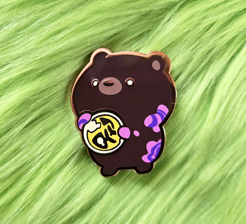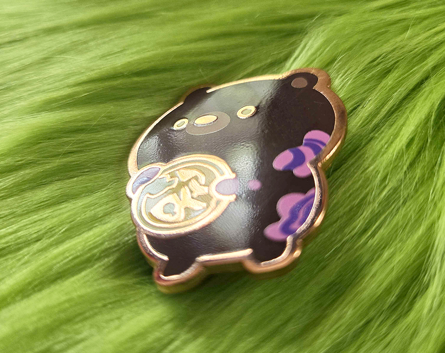 Enamel pin measuring approximately 40mm. Hard enamel, rose gold plated. Two rubber clutch backings.